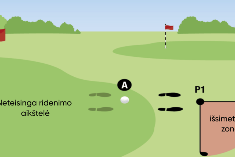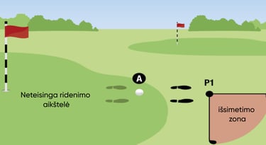 Kai Jūsų kamuoliukas yra neteisingoje ridenimo aikštelėje arba neteisinga ridenimo aikštelė fiziniame lygmenyje trukdo Jūsų numatytai stovėjimo ar smūgio zonai, Jūs negalite žaisti kamuoliuko iš ten, kur jis atsigulė. Vietoj to, turite be baudos išsimesti kamuoliuką artimiausiame taške, numesdami kamuoliuką zonoje, kaip parodyta diagramoje.